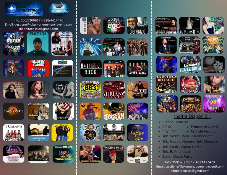 Siamo orgogliosi di presentarvi gli artisti che rappresenteremo in ESCLUSIVA per questa stagione… una selezione curata di talenti. I nostri artisti sono stati scelti per garantire: