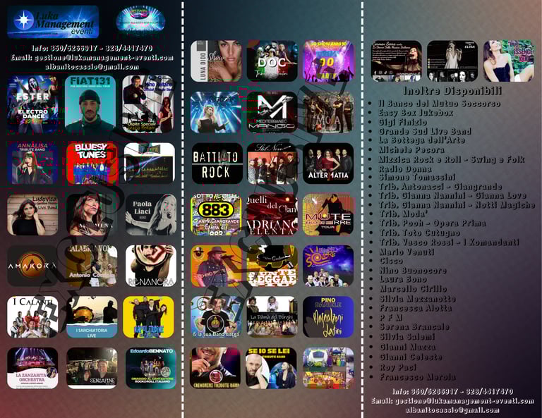 Siamo orgogliosi di presentarvi gli artisti che rappresenteremo in ESCLUSIVA per questa stagione… una selezione curata di talenti. I nostri artisti sono stati scelti per garantire: